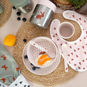 Pojemnik - termos obiadowy niemieckiej marki LASSIG przyda się nie tylko podczas podróży, ale także spacerów czy wycieczek. Termos ma pojemność 315 ml, jest lekki, poręczny i wytrzymały – dzięki podwójnym ściankom ze stali nierdzewnej długo zachowuje temperaturę posiłków, zarówno gorących, jak i zimnych. Szeroki otwór ułatwia napełnianie, podawanie jedzenia i czyszczenie. Hermetyczna jasnoróżowa pokrywka dobrze przylega do pojemnika, posiada także dodatkową silikonową uszczelkę, zapewniającą szczelność naczynia. Pojemnik jest łatwy w obsłudze i ma ergonomiczny kształt – z łatwością zmieści się do plecaka, torebki czy bocznej kieszonki. Ma srebrny kolor z grafiką zajączka w kolorze terakoty.