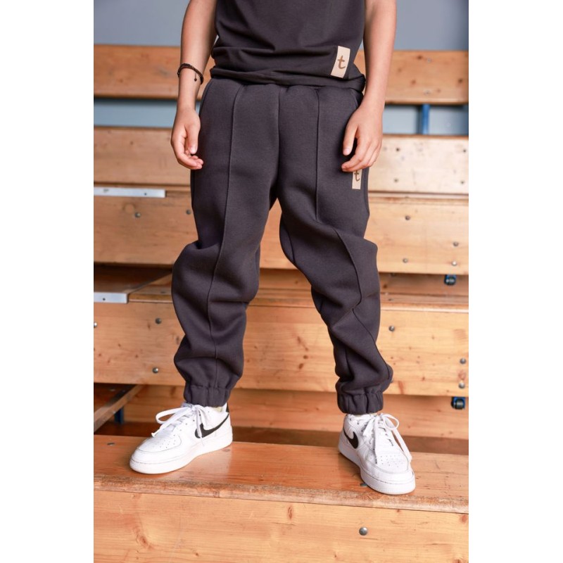 Ocieplane spodnie dresowe o nowoczesnym kroju, z przeszyciem na środku nogawki . W pasie wykończone gumą a przy nogawkach ściągaczem bawełnianym, spodnie posiadają kieszenie