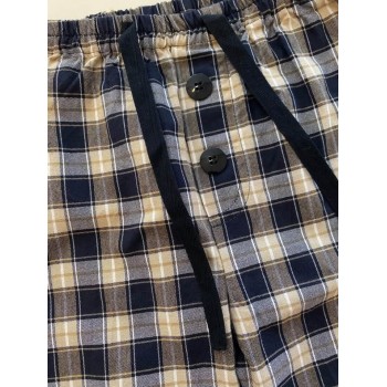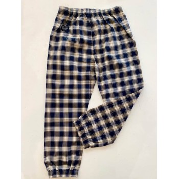 Cienkie spodnie, w pasie gumka. Sznurek i guziki do dekoracji. Na dole ściągacz. Kratka w kolorze beżowo-brązowo-grafitowym.