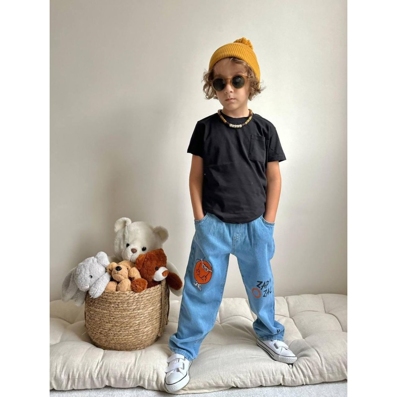 Spodnie jeansowe kroju boyfriendy. Gumka w pasie. Wygodne i stylowe. Wykonane z miękkiej bawełny jeansowej. Ozdobne aplikacje na przodzie spodni.