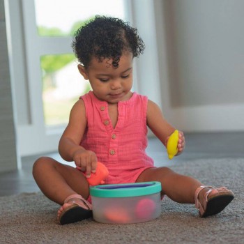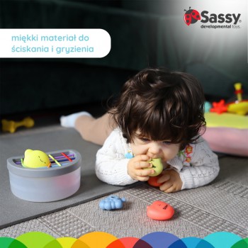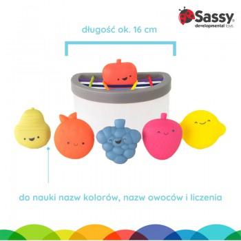 Sorter dla niemowląt i małych dzieci w formie kubeczka z 6 kolorowymi owocami. Zadaniem maluchów jest przecisnąć kształty przez pokrywkę ze sznureczkami. Zabawa sorterem Sassy to okazja dla najmłodszych do ćwiczeń motoryki małej oraz nauki nazw kolorów, owoców, a także nabycia nowej umiejętności liczenia. Owoce są miękkie i przyjemne w dotyku, zatem można je bezpiecznie gryźć i ściskać.