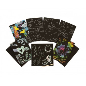 Czarne arkusze skrywają wewnątrz wiele kolorów. Wystarczyć zdrapać wierzchnią warstwę drewnianym patyczkiem i stworzyć piękne ilustracje. Dzieci mogą wymyślać wzory samodzielnie lub skorzystać z gotowych.