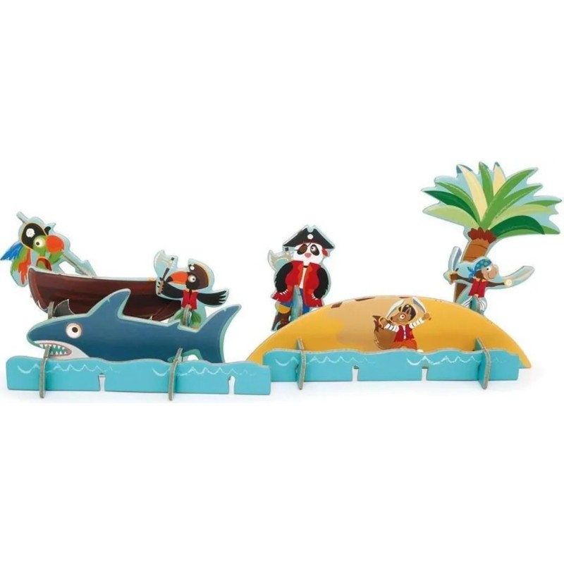 Puzzle Piraci to zestaw składający się z 36 dużych i bardzo dużych elementów. Wspaniała rozwijająca zabawa dla każdego malucha, który lubi zabawę z puzzlami. Poszczególne elementy należy dopasować i połączyć ze sobą tak, aby stworzyć obrazek. Możemy również z tego samego zestawu stworzyć makietę 3D. W tym celu należy poszczególne elementy połączyć ze sobą na wcisk i powstaje piękna scenografia. Produkt wykonany z wysokiej jakości grubej i delikatnej w dotyku, bez ostrych krawędzi tektury.